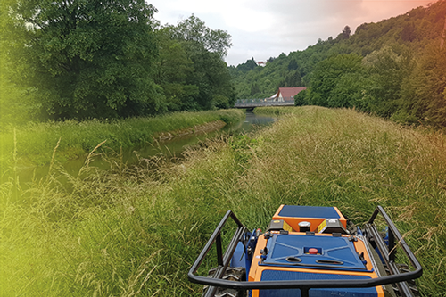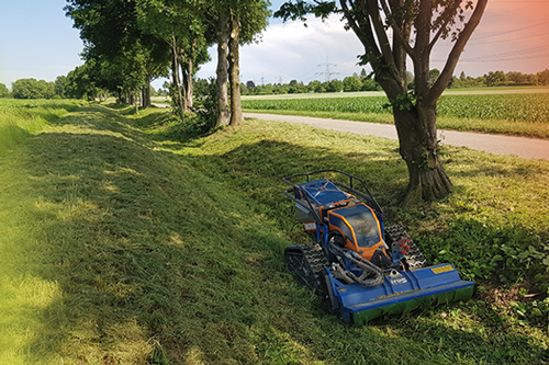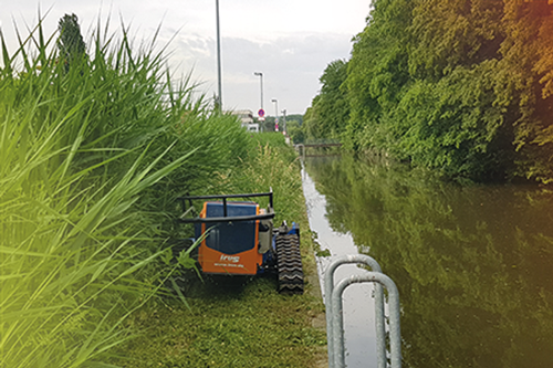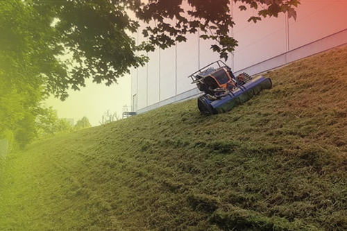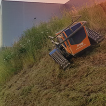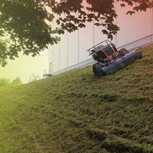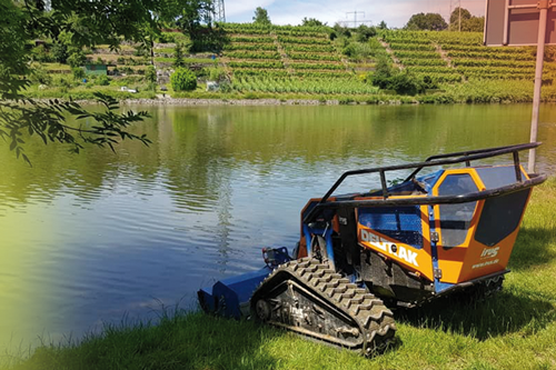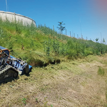 Auch Regenrückhaltebecken, Straßenböschungen und Wasserdämme mit ihren sehr steilen Böschungen, müssen regelmäßig gemäht und sauber gehalten werden. Mit unserer Mähraupe können wir auch diese stark abfallenden Böschungsneigungen befahren.