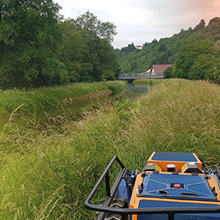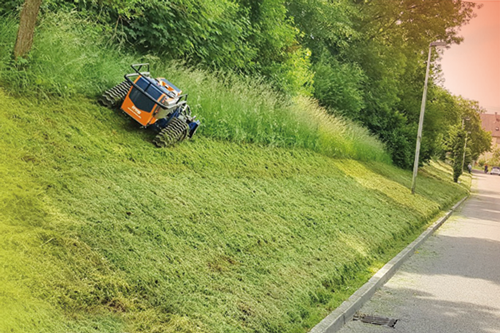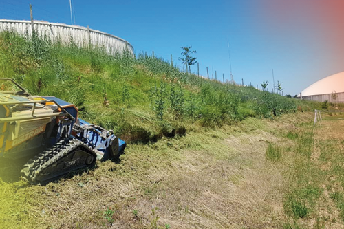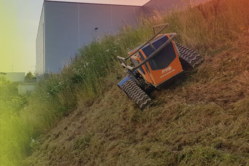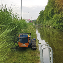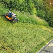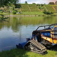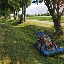 Auch Regenrückhaltebecken, Straßenböschungen und Wasserdämme mit ihren sehr steilen Böschungen, müssen regelmäßig gemäht und sauber gehalten werden. Mit unserer Mähraupe können wir auch diese stark abfallenden Böschungsneigungen befahren.